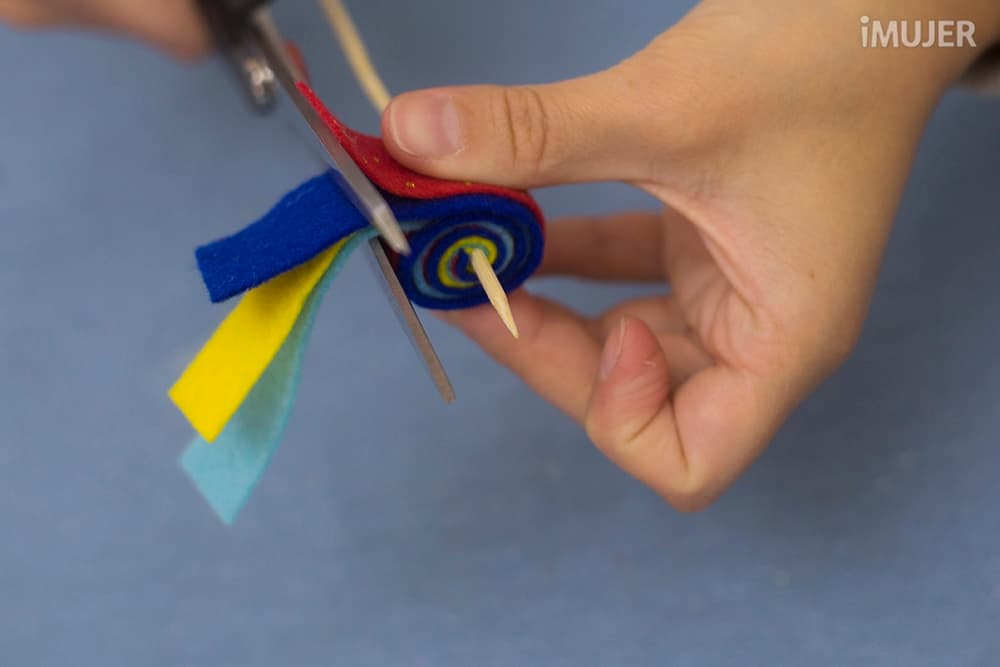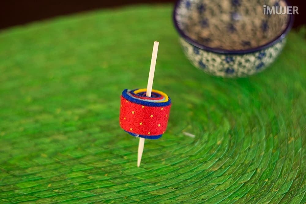 Recorta las tiras sobrantes y deja la tira exterior un poco más larga que el resto. Cierra el trompo pegando esta tela externa y corta el palillo.