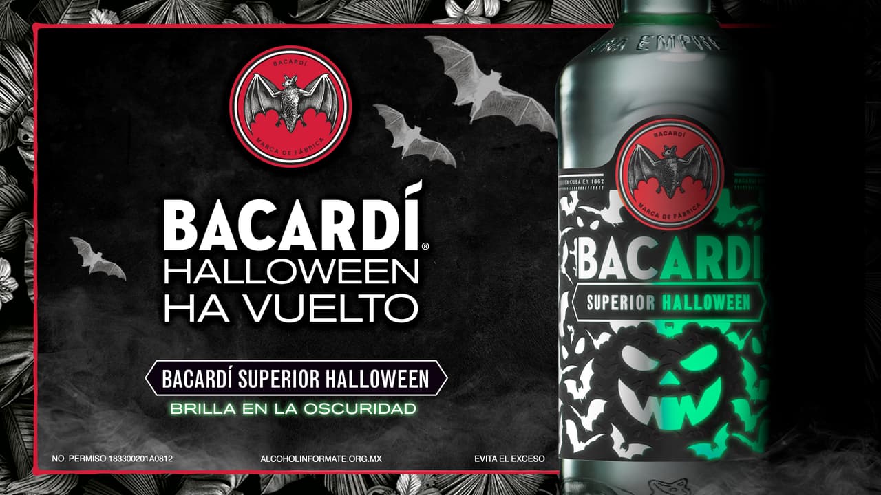 Para crear un mayor impacto, puedes ponerle una veladora de luz led para que brille en la oscuridad, así como la nueva botella de Bacardí Superior edición Halloween, que destaca sus murciélagos fluorescentes que brillan cuando apagas las luces.