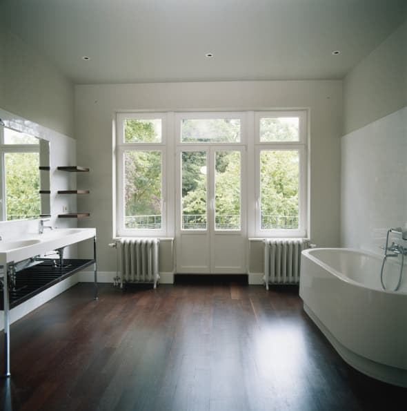 Una idea simple y económica es pintar el exterior de la bañera. En un clásico baño de color blanco el negro de la bañera sin duda llamará la atención y aportará mucho estilo. Más aún si optas por empapelar una zona con un delicado papel con diseños en ambos colores. Solo debes aplicar dos manos de pintura al exterior de la bañera y dejar secar.