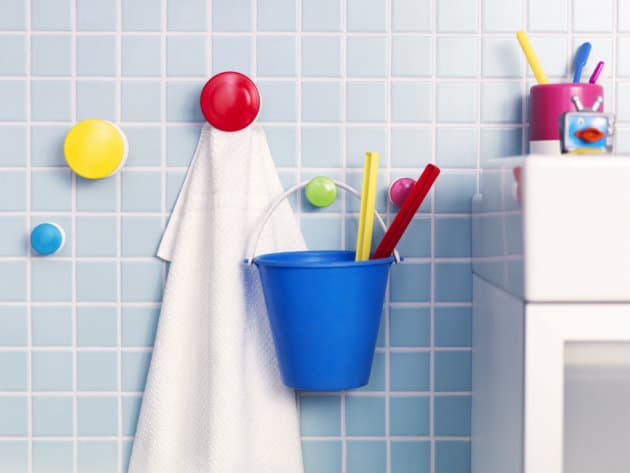 Las paredes no solo son para el botiquín de medicinas. Puedes colocar rieles y cestas para almacenar todo, desde toallas hasta papel higiénico. Para ellos puedes utilizar la línea Stugvik de IKEA y ni siquiera tienes que hacer huecos en las paredes porque todo es con chupones.
