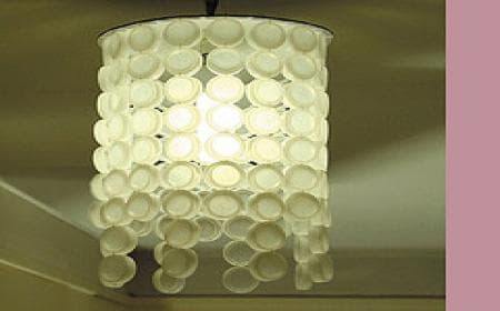 3) Lámpara: Debes hacer dos agujeros en cada tapa en línea recta. Para ello se necesita: una superficie plana, un martillo, un clavo y un papel con una línea recta trazada a través de él. Usa esta línea para orientar el clavo a través de cada tapa de la botella, una vez que están todas las tapas perforadas, utiliza alambre para unirlas (en la lámpara de la foto se utilizan 16 cuerdas de 7 o 9 tapas cada uno.) Al final coloca cada cadena en un marco o un círculo de cartón.