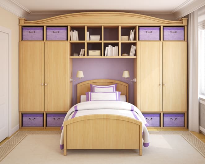 Un armario del piso al techo y de lado a lado de una pared, ayuda a aprovechar al máximo el espacio de almacenamiento en una habitación. También puedes utilizar estanterías para los libros, y mesas de noche con cajones.