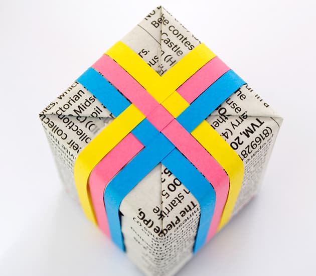 Puedes adornar un regalo ya envuelto con tiras entretejidas de colores.
