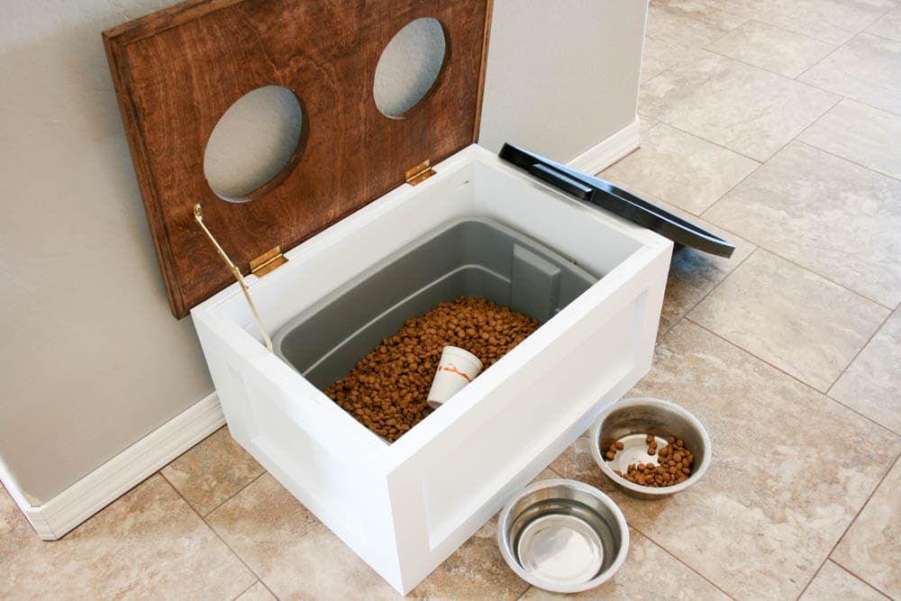 Puedes crear una caja que tenga la doble función de guardar la comida de tu perro y de ser el soporte de los recipientes de comida. ¡Es una muy buena idea!