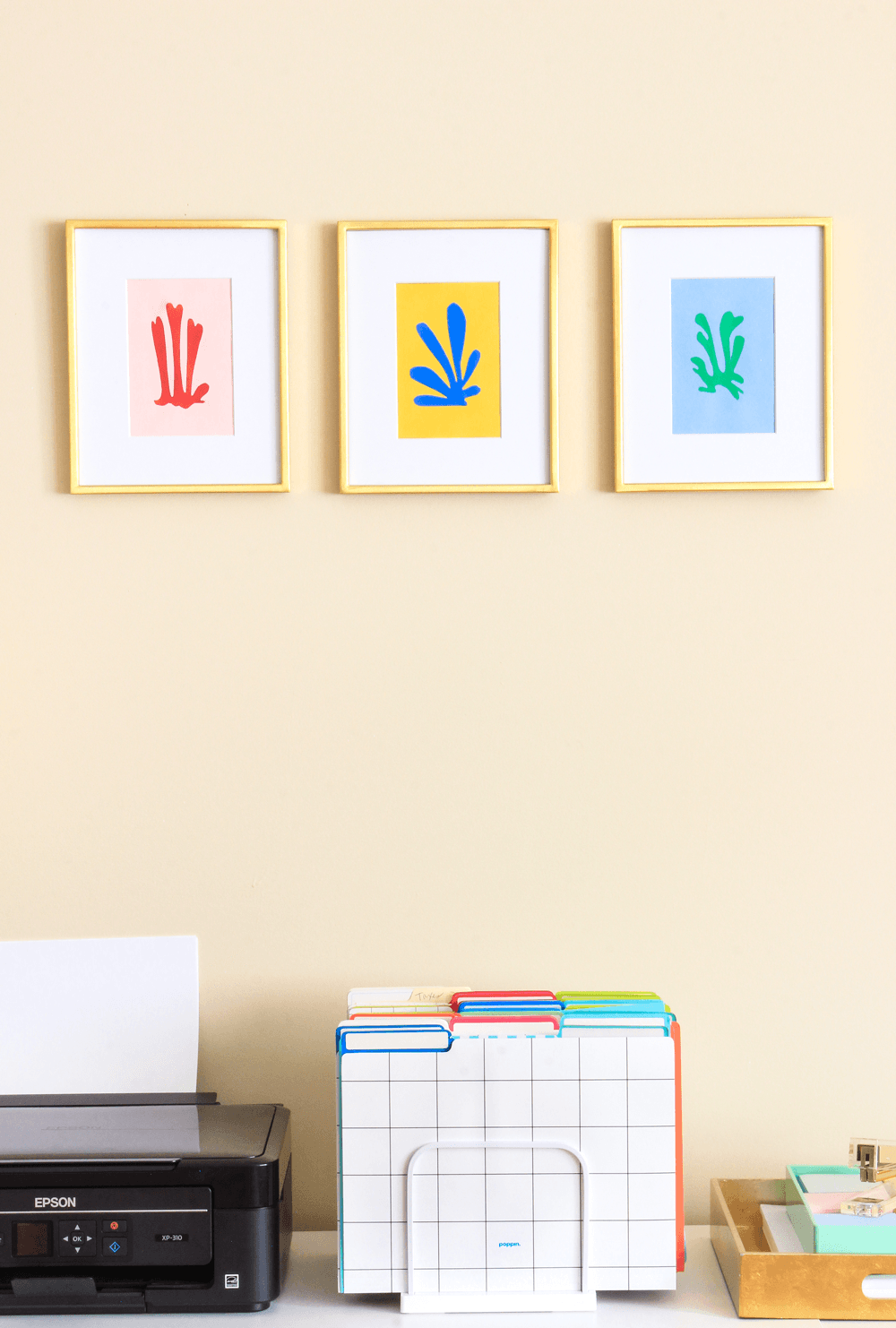 Con simple cartulina de colores puedes hacer recortes y crear uno o varios pequeños cuadros que le darán alegría y color a tu dormitorio.