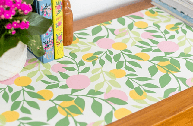 Otra sugerencia interesante, es embellecer la superficie de tu cómoda y mesas de noche con papel tapiz, que luego podrás remover o cambiar por otro.