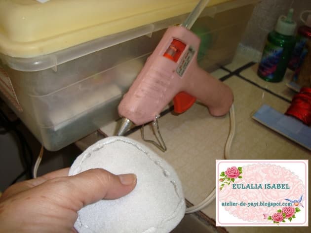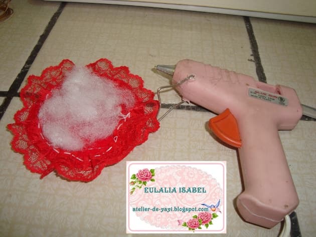 Pega el encaje con la pistola de silicona a uno de los círculos. Coloca el relleno.