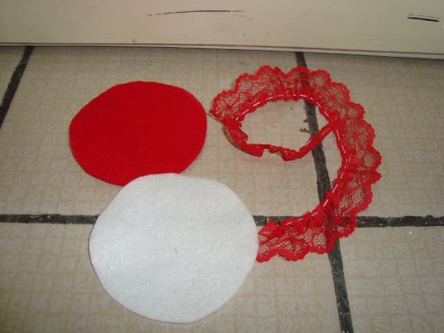 Dibuja un círculo con el cartón. Toma el paño de acuerdo a los colores deseados y corta dos veces. Riza el encaje con aguja e hilo a medida del círculo cortado.