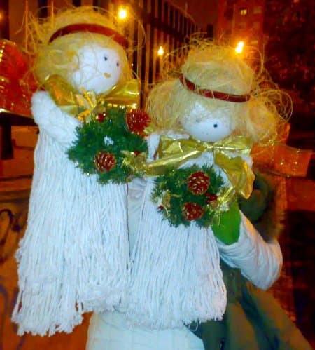 Trenzar una hebras de cada lateral de la fregona y unirlas al al final con un ramillete navideño. Ponerle una corona o acicalar al gusto.
