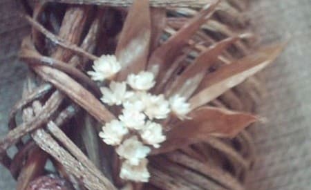 Continuaremos enrollando hasta que casi desaparezca la estructura. Antes de terminar, comenzaremos a combinar otros elementos que sujetaremos con las últimas vueltas: flores secas, ramitas, frutos, etc.