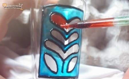 Una vez que estuvo seco (dejé secar 8 horas para asegurarme) rellené los espacios internos del dibujo con las pinturas para vidrio de colores, comenzando con el fondo turquesa. Además, usé rosado intenso (el color que parece rojo), rosa suave, amarillo piel y verde manzana.