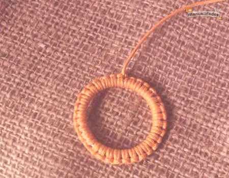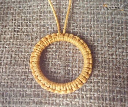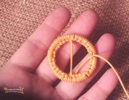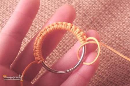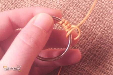 De esta forma continúas anudando hasta forrar completamente el aro de metal.