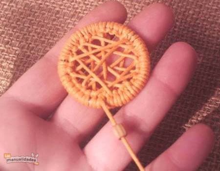 Cose de forma despareja hasta llegar a un diseño que te agrade. Cuando termines haz un nudo y enhebra en el hilo una cuenta pequeña de madera.