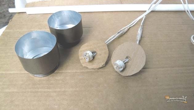 El tercer paso es pintar las latas con un esmalte dorado o plateado (yo utilicé dorado y luego plateado) y armar los portalámparas con un cable y una ficha. Yo utilicé una lamparilla dicroica, pero se puede utilizar otra lamparilla pequeñita, como una lamparilla mignón. En realidad aconsejo utilizar una lamparilla común muy pequeña, pues con la dicroica es más difícil luego armar el alambre y habrá que agujerear la lata, pues he notado que se empaña el vidrio.