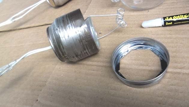 Sólo resta agregarle la tapa que va a ser el elemento de seguridad, para poder enroscar el frasco y que no se caiga. Esto lo hacemos agujereando la tapa y adhiriéndola a la lata con un pegamento potente.