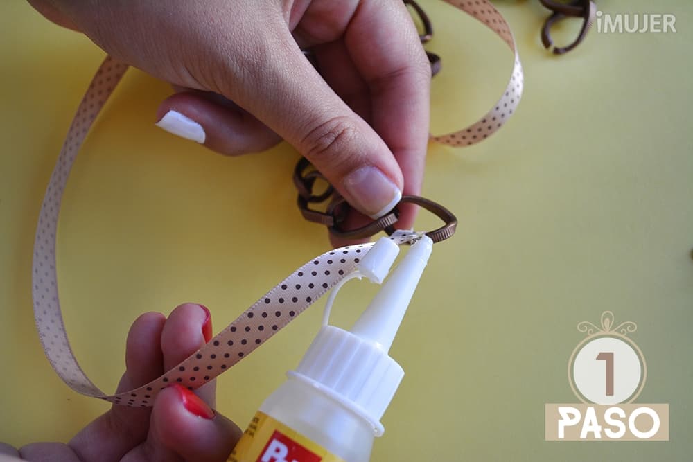 Comienza pegando una punta de la cinta decorada a la cadena gruesa con la silicona líquida.