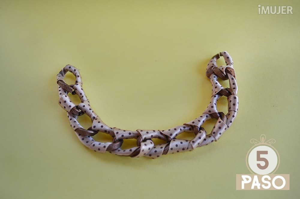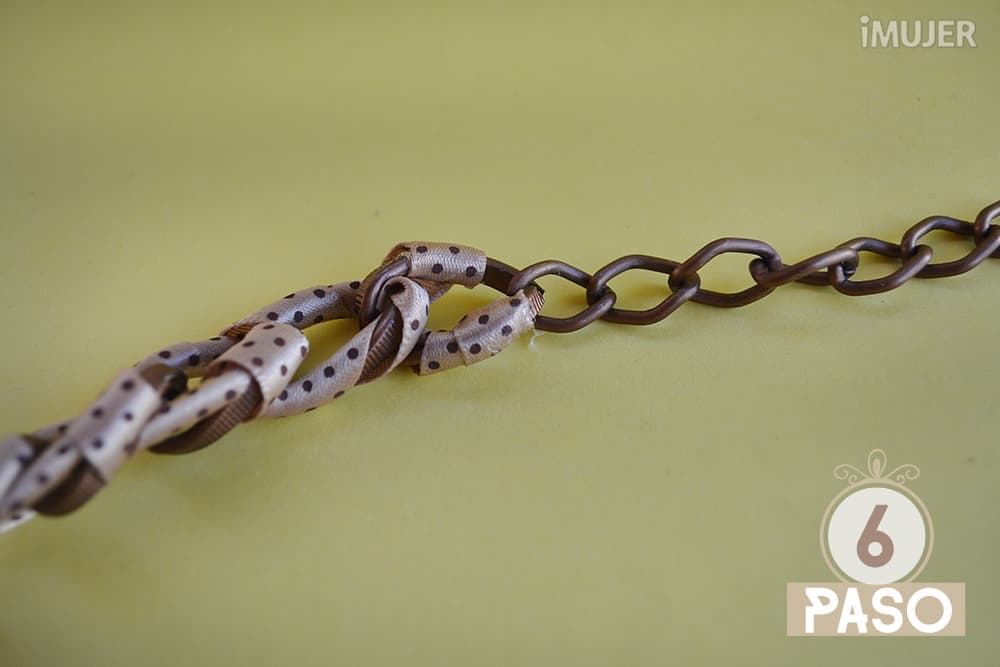 Así la cadena quedará cubierta por la cinta y bien entrelazada para que no se salga.