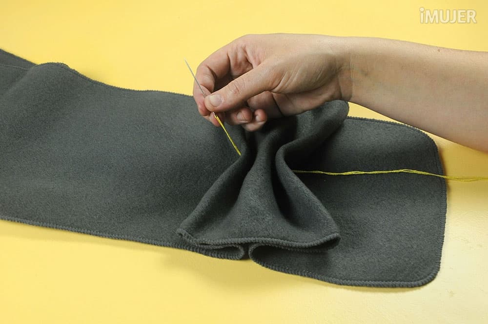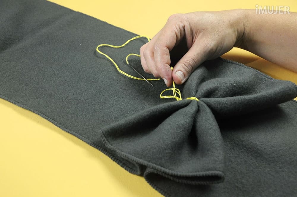 Luego tira del hilo para que se frunza y quede una moña en tu bufanda.