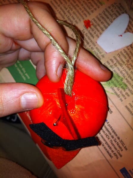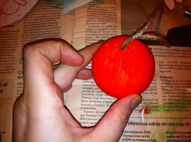 Pinta la bola de porexpan de rojo, utilizando témpera normal de papel. Déjala secar (puedes ayudarte de un secador de pelo para que seque más rápido)