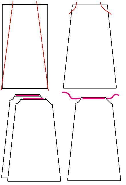 Cuando tengas ambas piezas listas, corta dos tiras en tela rosa de igual largo que el lado superior del vestido y de unos 6 cm aprox. Enfrenta una tira con el derecho del vestido y cose por el borde. Ahora da vuelta la tira cosida hacia atrás y cosela quedando un dobladillo de uno tres cm. Realiza lo mismo con la otra pieza del vestido.