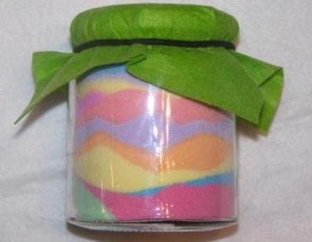 Beatriz nos envía esta preciosa técnica para decorar un poco nuestra casa (o para regalar como lindos souvenirs a quienes queramos!). Se trata de un bote de sales de colores con el que podrás probar distintos diseños y divertirte un buen rato.