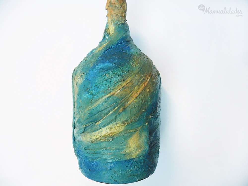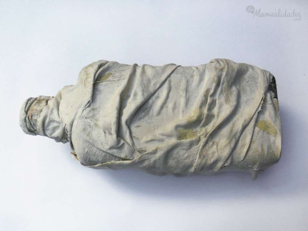 Una vez que tenemos preparada la pasta endurecedora, dejamos la tela en remojo por unos minutos y con luego forramos la botella envolviéndola completamente dejando libre la base. Mientras envolvemos, apretamos la tela para que adquiera un aspecto arrugado.