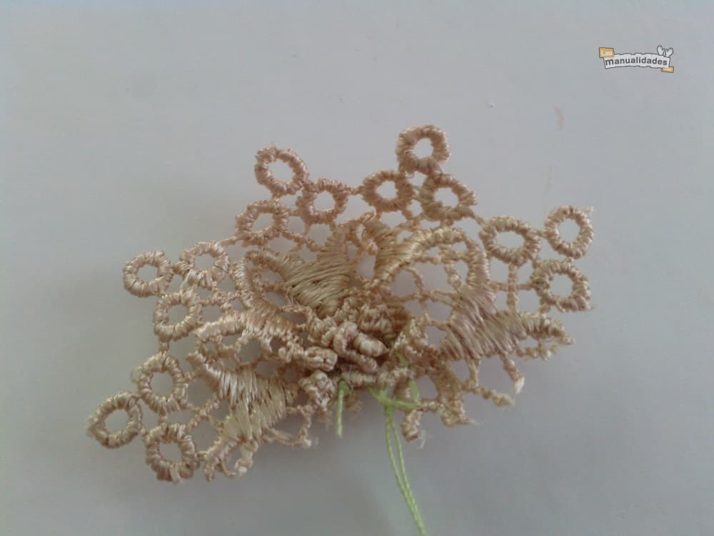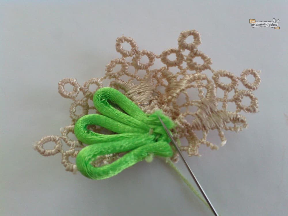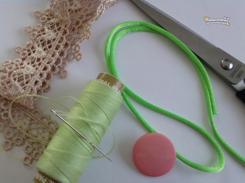 Ponemos el encaje como base y le cosemos la cola de ratón, y encima el botón.