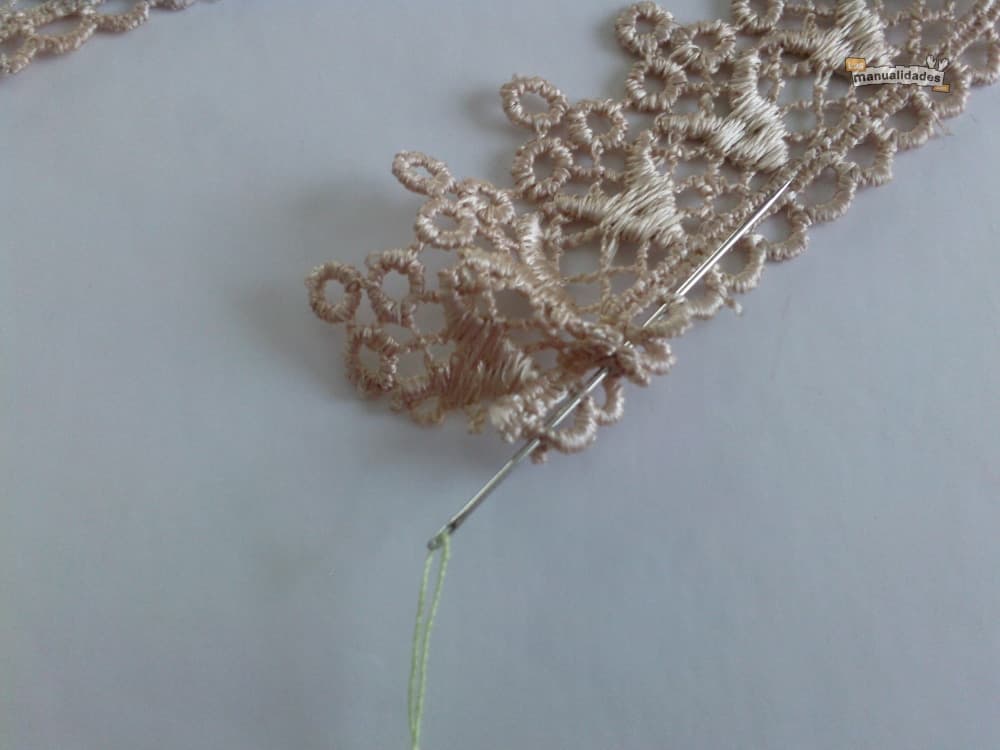 Pasamos la aguja con el hilo por la base del encaje y fruncimos.