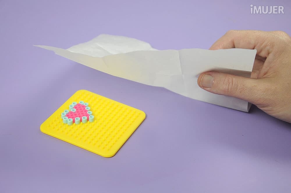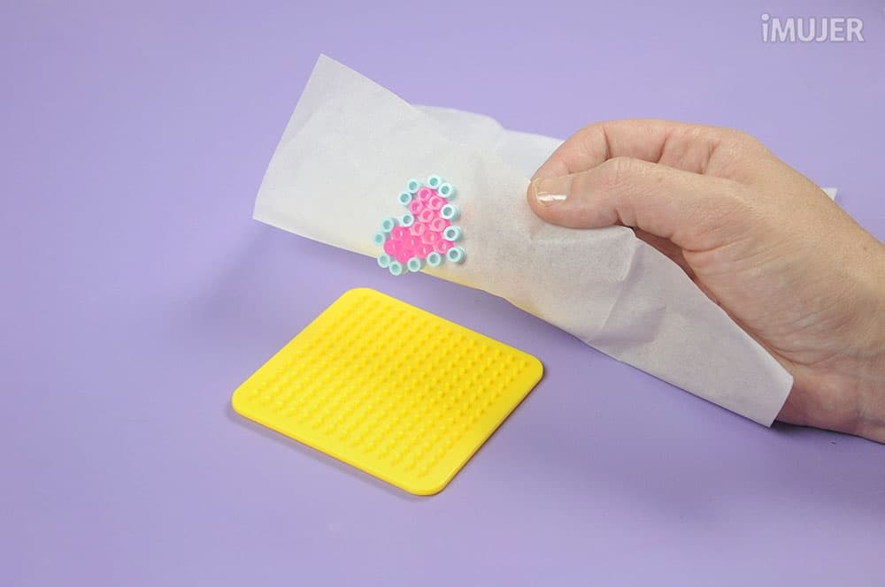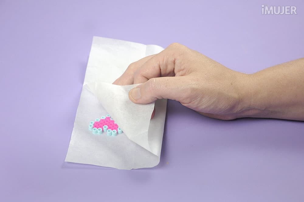 Cubre el diseño con el papel para perler y plancha en forma circular a temperatura media.