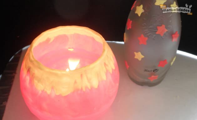 Y para hacer el fondo del portavelas, con los restos del primer color, hacemos un churrito y en el mismo objeto comenzamos a enrollar y a fundir para que quede una base resistente y atractiva.