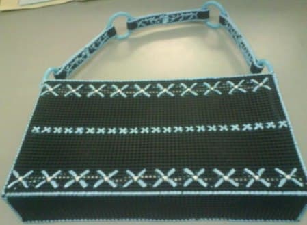 Hacerle con la rafia el diseño que desee en la camba posterior a eso forrar por dentro con la tela con las parte de 10" x 1-1/2cm unirlas con los aros igualmente el de 3" x 1-1/2 cm que va unido al pedazo de 2" x 6" el zipper va pegado a los lados de 2cm x 10" luego solo queda empatar formando la cartera como se ve en la imagen.