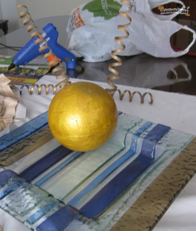 Comienza por pegar la bola de poliespan al plato con un poco de silicona caliente.