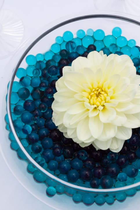 En primer lugar puedes crear un centro de mesa con velas flotantes (como te enseñamos hace poco). Para eso coloca un recipiente transparente con velas flotantes de colores. Es una opción sencilla y económica. El centro de mesa de la imagen principal está hecho con velas con florales en distintos colores pasteles.