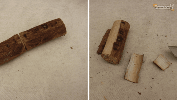 Una vez que tengas la ramita cortada, quítale la corteza utilizando un cúter o el mismo cortaplumas.