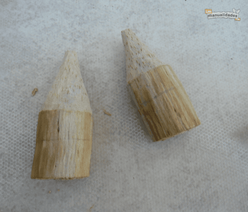 El paso siguiente es marcar con un lápiz en donde irá el sombrero y la cara del duende. Toma el cortaplumas y el cúter y comienza a desbastar la parte del sombrero, haciéndole filo a la ramita como si fuera un lápiz.