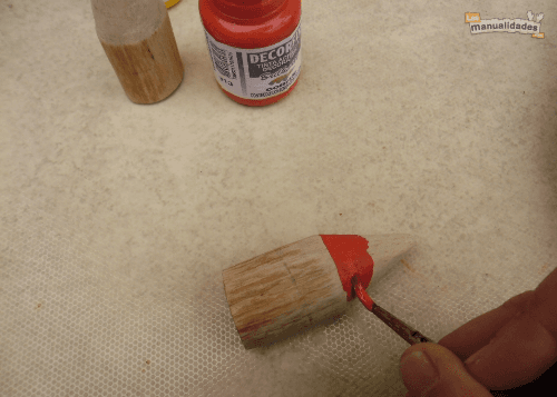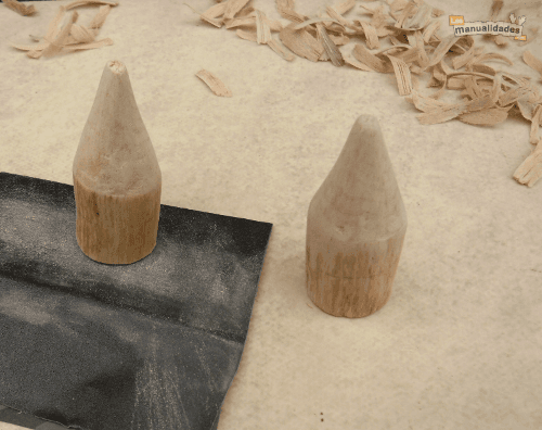 Lija bien la madera para alisar el sombrero del duendecito. También lija la parte inferior, raspando la ramita sobre la lija apoyada en la mesa.