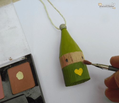 Luego de que el pegamento se haya secado, hazle al duende unos puntitos negros en forma de ojos, píntale una decoración en el cuerpo (como un corazón o unos botones) y enhebra el cordel en el agujero de la cuenta.