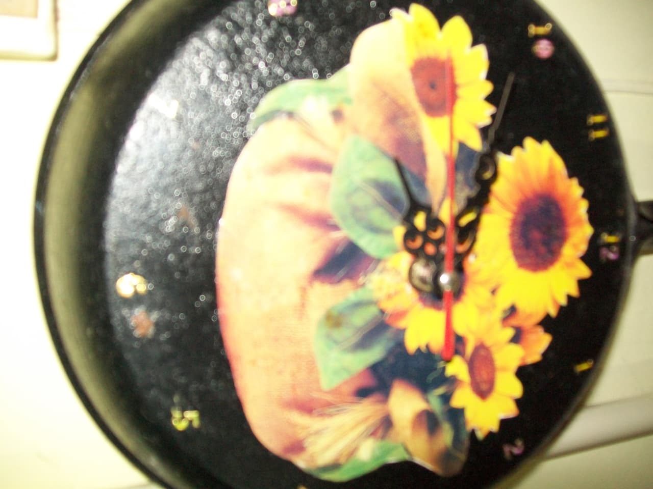 Primero tomo la sartén y la limpio. Le practico un orificio con una perforadora, donde luego colocaremos la máquina de reloj. Seguido a este paso lo pintamos con un convertidos de oxido color (el que elijamos). Luego tomamos papel de calcar y transferimos el dibujo.