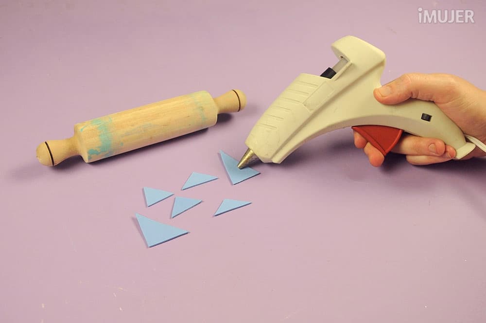 Con la pistola de silicona, pega los triángulos de goma eva en el rodillo.