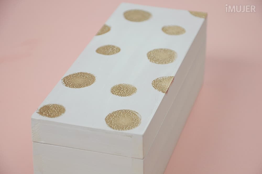 Estampa lunares dorados con la esponja por toda la tapa de la caja, esto le dará mucho glamour.