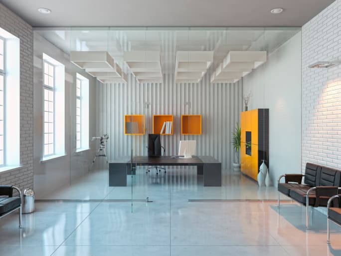Con una buena iluminación moderna y minimalista podemos lograr efectos muy interesantes…sobre todo si revestimos alguna pared o el techo de nuestra oficina con tablones o grandes cuadrados de luz. ¡Queda muy interesante!