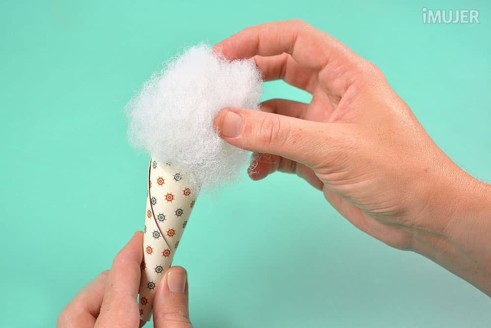 También con la pistola de silicona pega algo de guata sobre el cono formando el algodón.