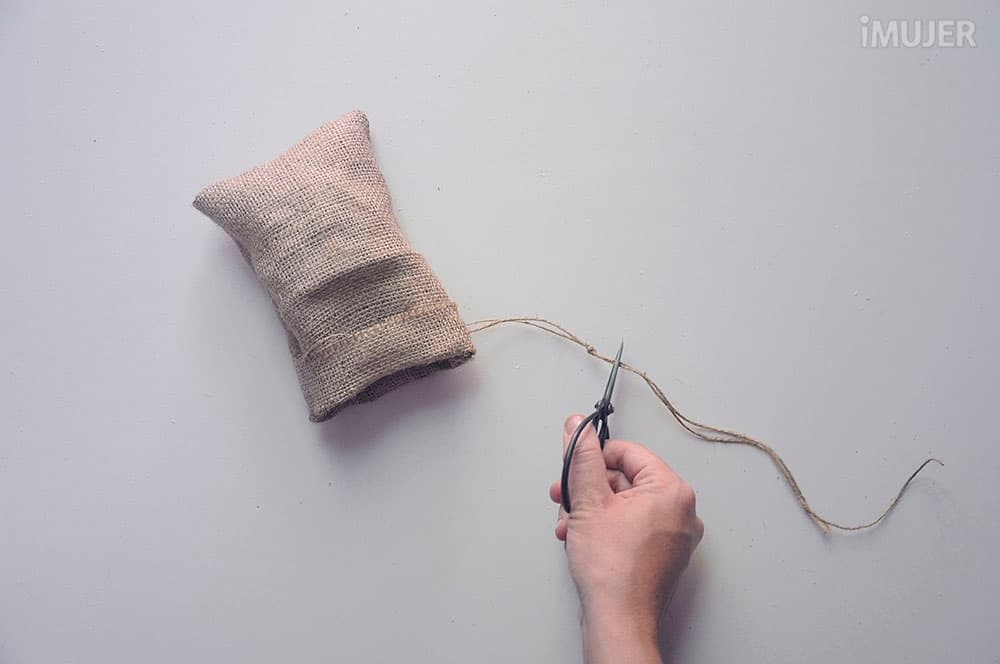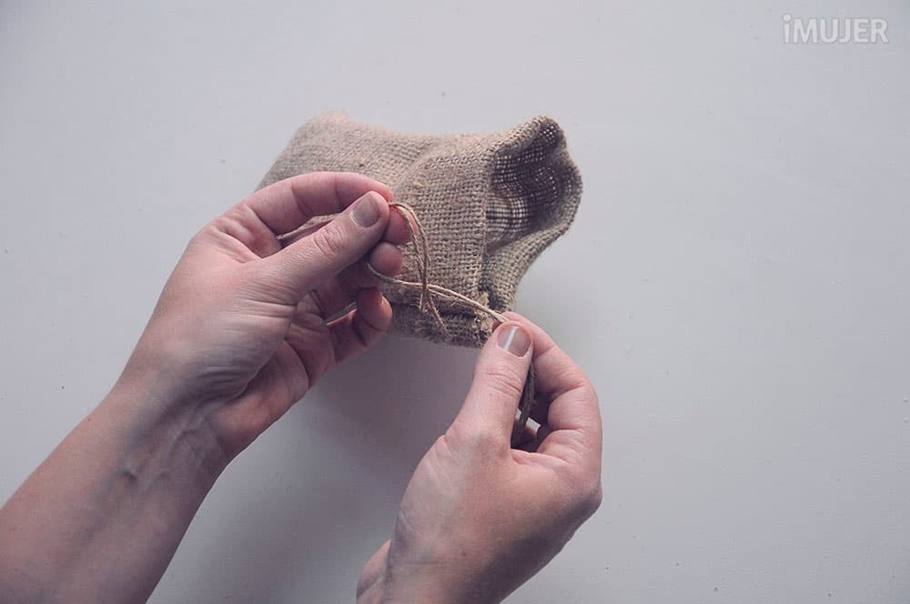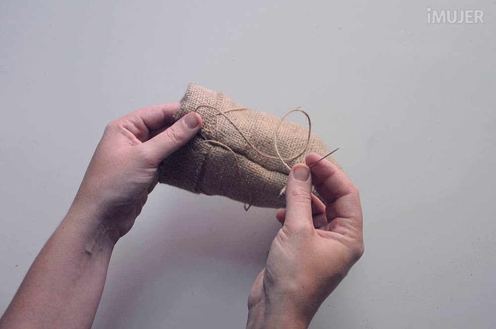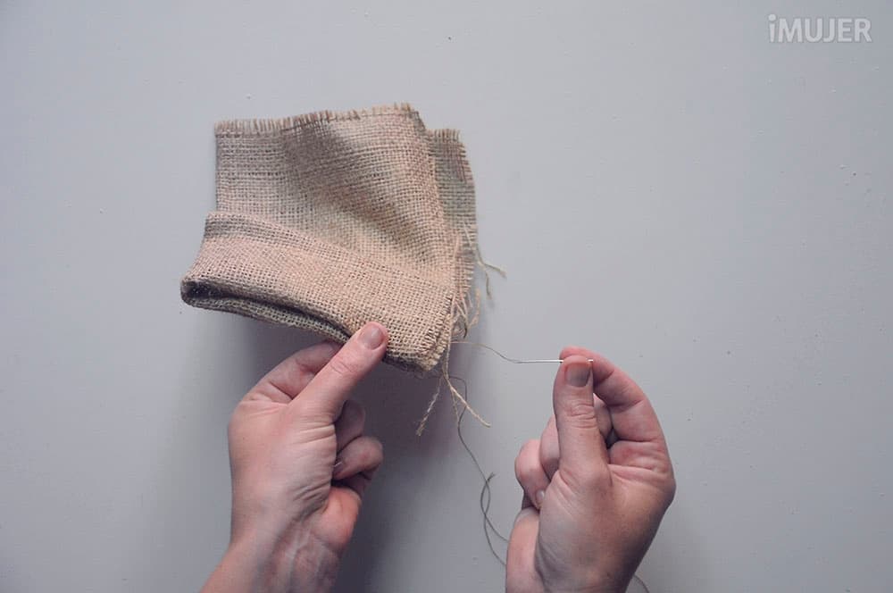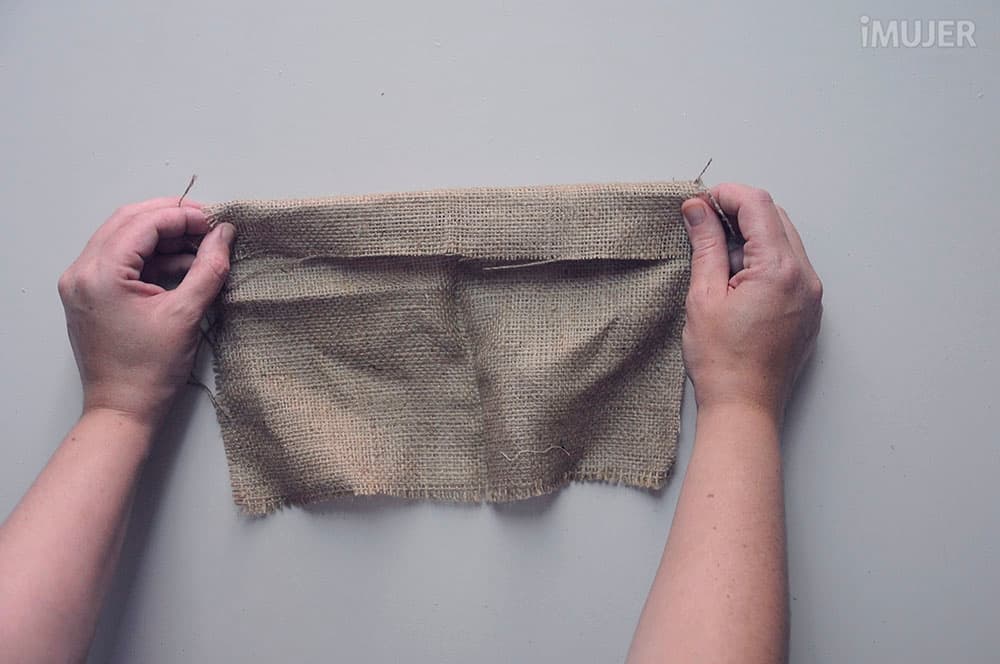 Cose los lados de la arpillera formando una bolsa. Luego, pon la bolsa del lado del revés, de esta forma quedarán las costuras del lado de adentro.