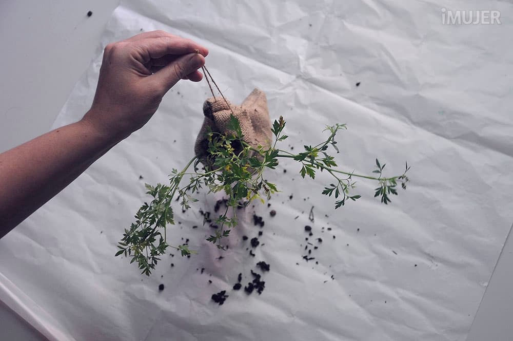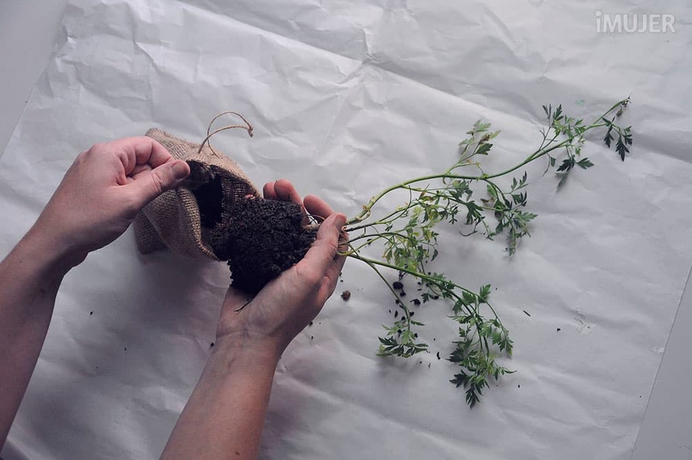 Traspasa la planta de la anterior maceta a la nueva y luego tira el hilo para cerrar un tanto la boca de la maceta.