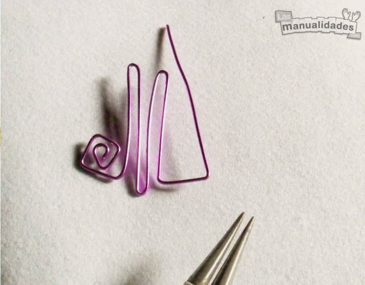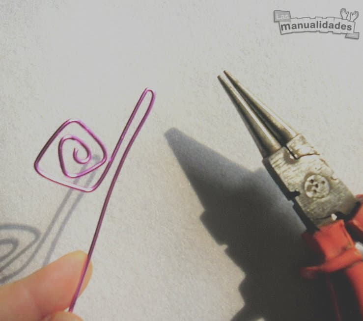 Luego continúa enrollando el alambre dándole forma triangular o cuadrada a cada vuelta, como más te guste. Al finalizar el espiral, aprieta el alambre con la pinza y da una media vuelta, para hacer una forma de “U”.