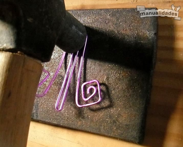 A continuación apóyalo en una plancha de hierro o en otra superficie dura y golpéalo con un martillo siguiendo la forma del alambre.