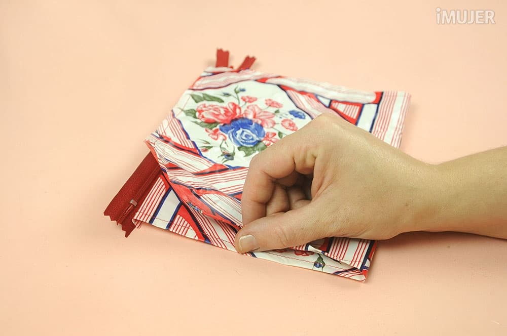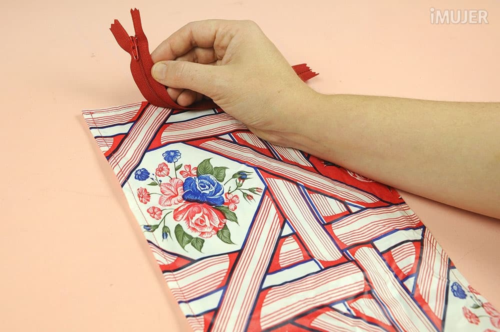 Pliega nuevamente a la mitad y une el cierre a ese otro extremo de la tela.
