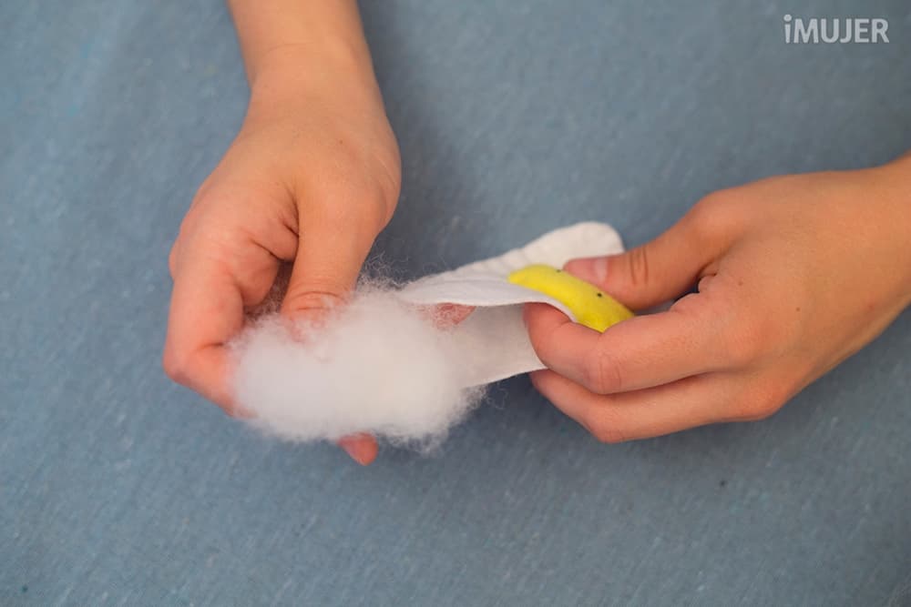 Rellena el alfiletero con la guata y termina de cerrarlo.