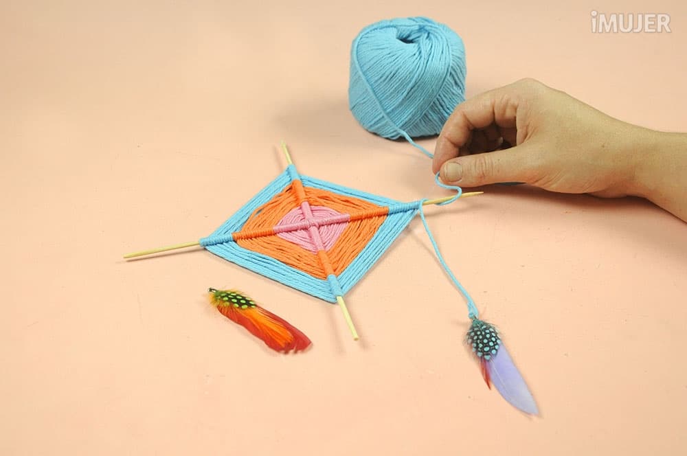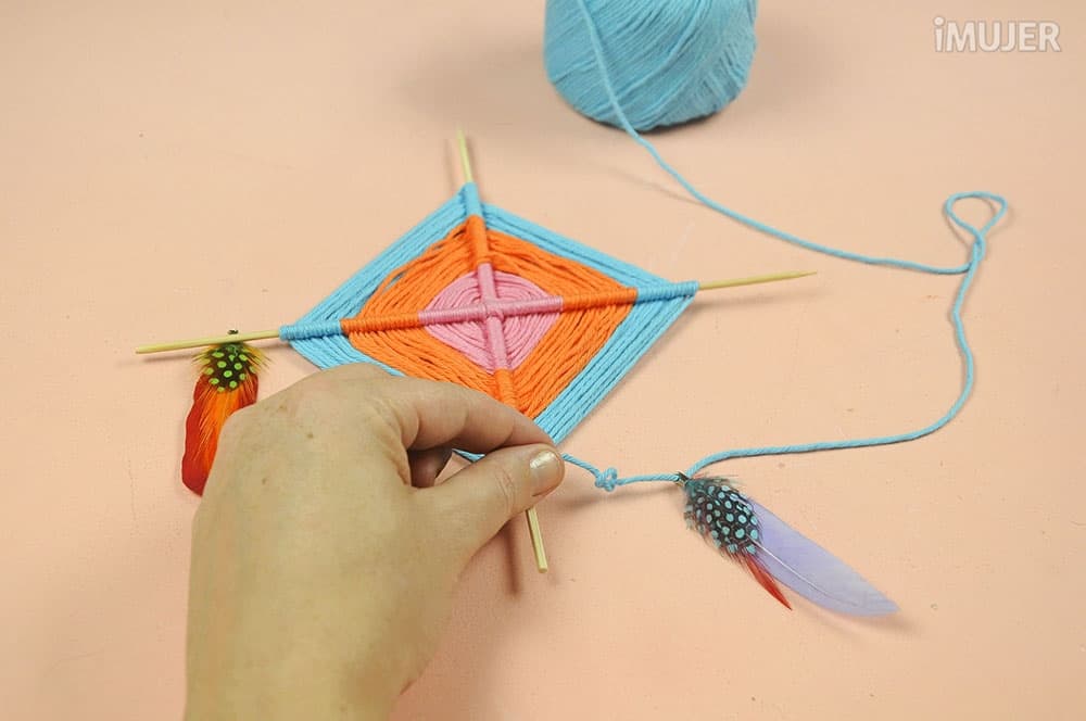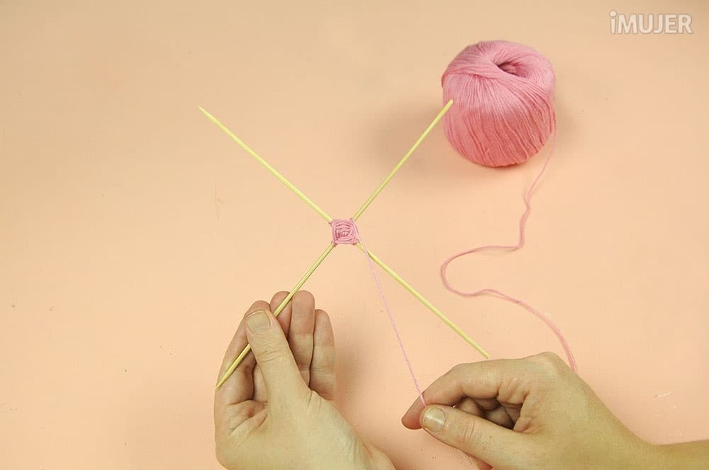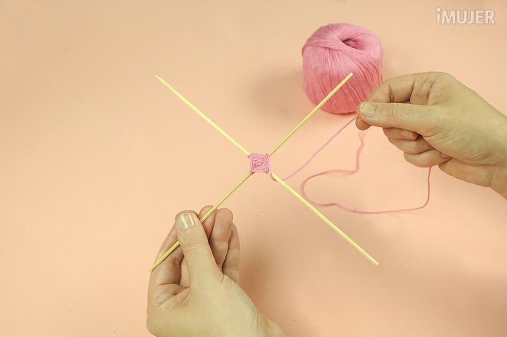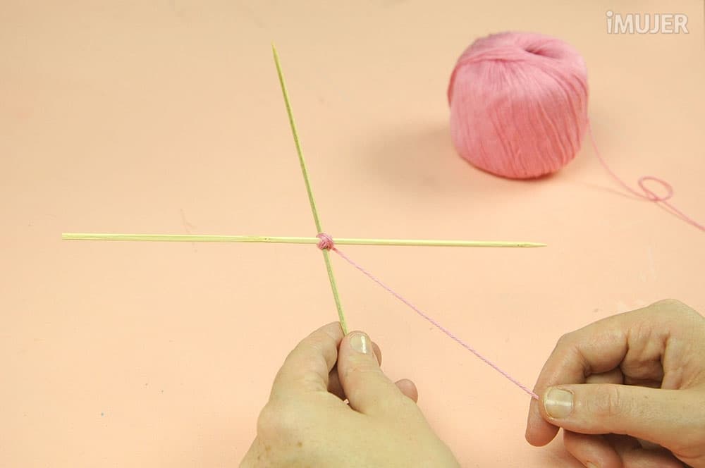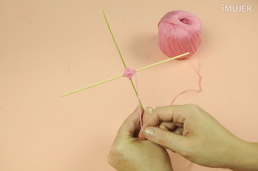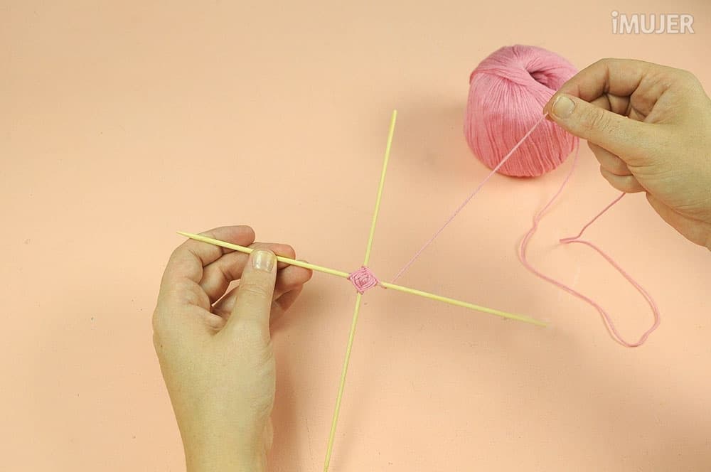 Haz un nudo con uno de los hilos y comienza a tejer el atrapasueños. Pasa el hilo por debajo de un palillo, dale una vuelta y sigue con el palillo de al lado.