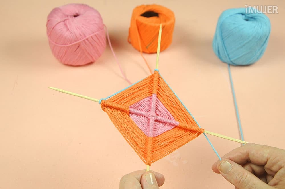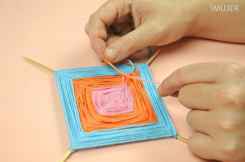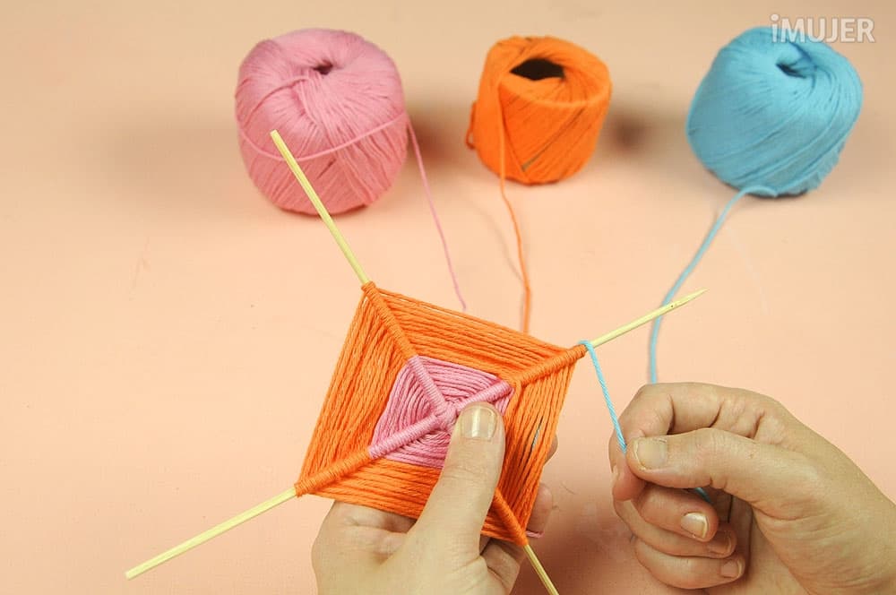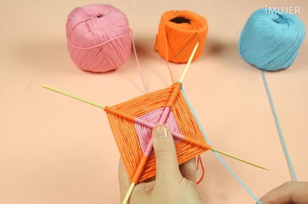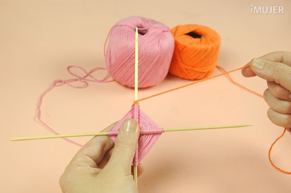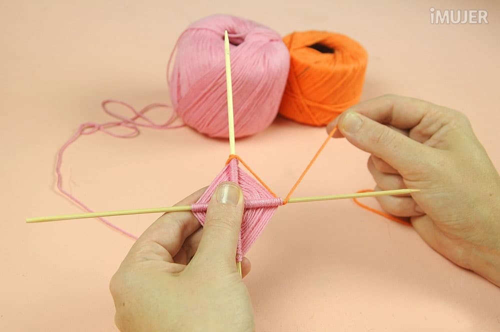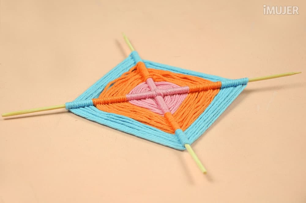 Haz un nudo con uno de los hilos y comienza a tejer el atrapasueños. Pasa el hilo por debajo de un palillo, dale una vuelta y sigue con el palillo de al lado.